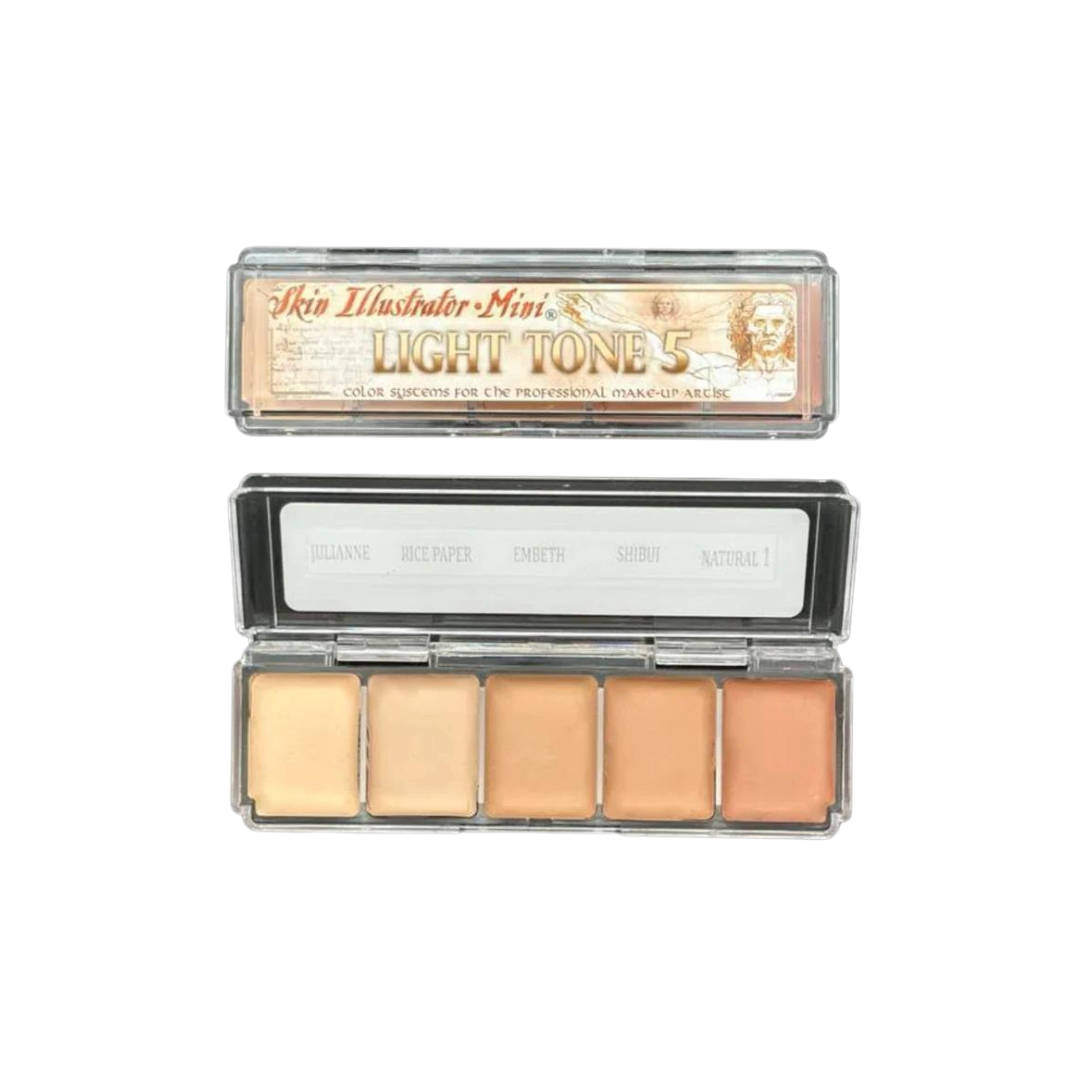 The Skin Illustrator Mini Light Tone 5 Palette contains: Julianne, Rice Paper, Embeth, Shibui, and Natural 1. The Skin Illustrator Minis are also great for students that are new to alcohol activated makeup by offering 25 different colors in a small, economical palette. All 5 Mini can be paired with each other for limitless possibilities.