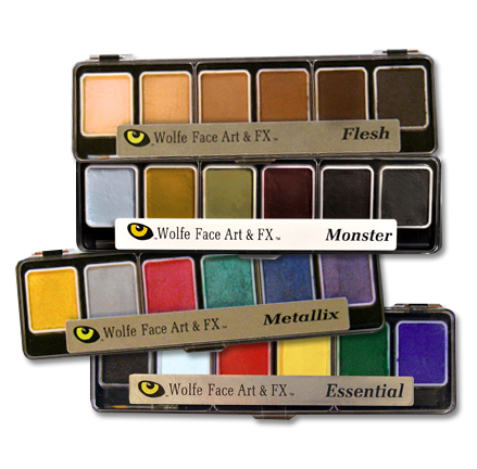 The Hydrocolor Palettes Line consists of the Essential (Red, Yellow, White, Lt Green, Blue, and Black) / Metallix (Gold, Silver, M Rose, M Green, M Blue, and M Fuchsia) / Monster (Blithe, Raw Sienna, Orc, Blood, Bruise, and Charcoal) / Skin (Fair, Rich Ivory, Honey Beige, Golden Bronze, Saddle Brown, and Ebony) / Warm Metallix (M Peach, M. Rose, M. Rosewood, M. Copper, M. Orange, M. Yellow).