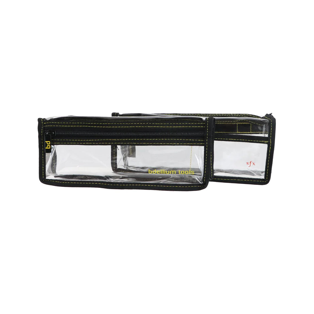 This Double Pouch accommodates the brushes in the Bdellium Tools SFX series. This SFX Double Pouch, part of the Bdellium Tools SFX series, is uniquely designed to help you carry your must-have brushes and tools for your work. This item can be separated into 2 single pouches or it can be attached using the 2 sets of velcro straps. Combined, this Double Pouch has 3 zip pockets with reinforced metal zippers and 2 slip-in side pockets for smaller, casual items. The pouches are made of clear, flexible plastic so that with one swift glance, you know what brushes and tools you have with you.