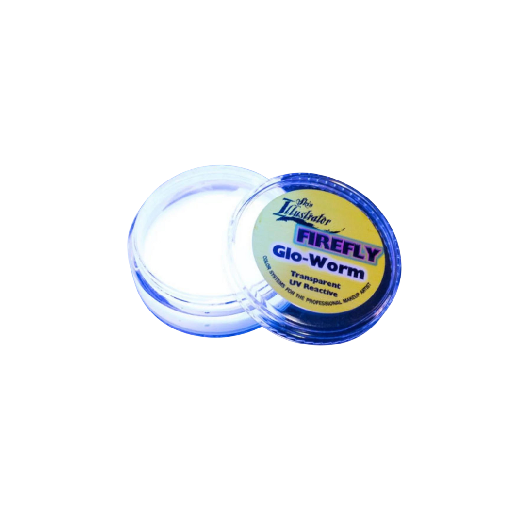 Glo-Worm is a new transparent UV-reactive illustrator color that glows under ultra violet light. It can be painted over any Skin Illustrator color or any water based color. It is safe for use on the face. Perfect for Halloween or Cosplay makeups. FX pigment for reveal effects.