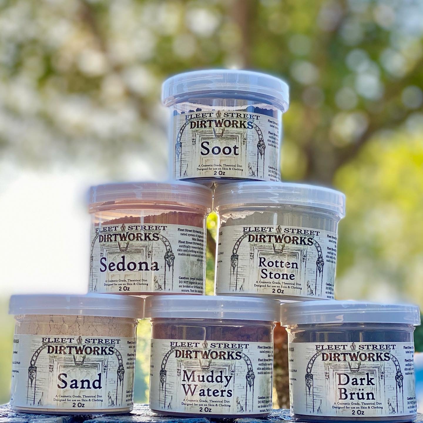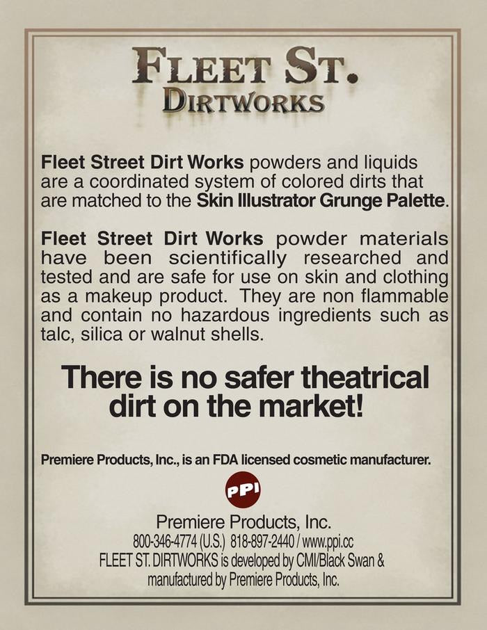 Dirtworks Powders are a coordinated system of colored dirts that are matched to the Skin Illustrator Grunge Palette. Dirtworks powders are the safest dirt on the market, as they do not contain any hazardous ingredients such as talc, silica or walnut shells. Use alone or with the Dirtworks Grime Sprays to create a variety "dirty" makeup looks. They also blend well with the Skin Illustrator Palettes, Liquids, Glazing Gels and Glazing Sprays. The Dirtworks powders are best applied when using the Dirtworks Dirt Bag. Use Dirtworks Dirt-Tac when only a powder look is required, this helps to hold the powders in place.