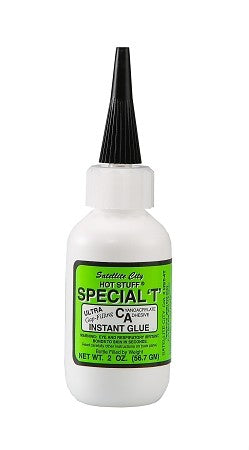 Special T THICK gap-filling CA glue (green label) has a viscosity (1150-1500) similar to honey. This super glue works great when you use it to bond both porous and non-porous parts, and it can fill larger gaps than our Super T medium CA glue. It is best used to glue parts that are missing pieces or don’t fit very well together. You can bond the same materials as with our other CA glue- wood, metal rubber, nitrile, composites, many types of plastics- and Special T is effective even when a poor fit makes parts look impossible to bond. The gap-filling capability is very useful when there is a large chunk missing from a surface- filling that space with Special T can preserve the structural integrity, seal the area from moisture and contaminants, bond something to the exterior that would not fit otherwise, cover and protect jagged edges, and improve the look of the surface.