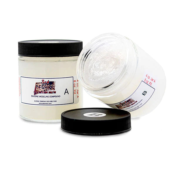 3rd Degree Silicone Modeling Compound is an extremely versatile product for creating realistic wounds and other special effects directly on the skin. Just mix Parts A and B together on a mixing palette and then transfer to the skin to model and sculpt your desired effect. No adhesive required! Use 99% Alcohol to thin the product and help blend edges. You can also shape it using a mold to prep your wounds ahead of time. It can be colored before or after it fully cures, which is approximately 10 minutes.