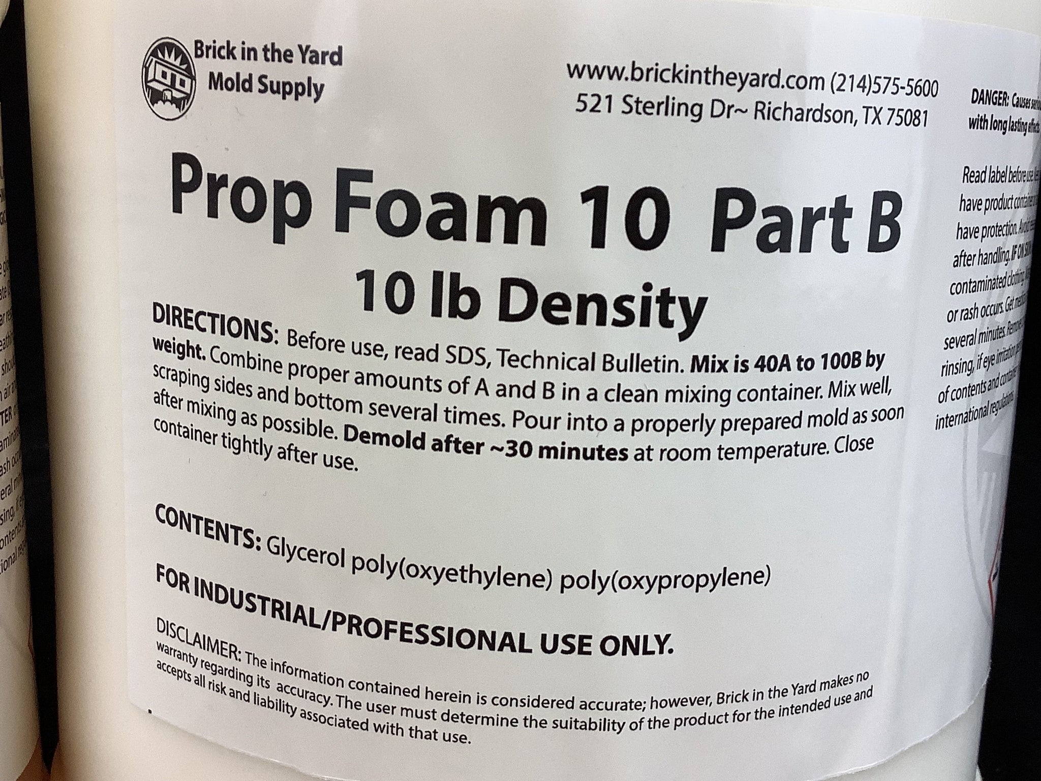 Prop Foam 10 expands to approximately 4-5 times the original volume or roughly 10lbs per cubic foot in free rise. Prop Foam work best in TinSil formula silicone molds such as 80-30.