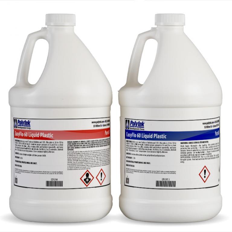 EasyFlo 60 Liquid Plastic is a two-part, liquid polyurethane resin that cures (RTV) to a white, Shore D65 plastic. This product has a simple 1A:1B mix ratio by volume and a fast demold time of 15 to 30 minutes. EasyFlo 60 is a super low-viscosity, pourable plastic, but it can be easily thickened with PolyFiber II Thickener for brush-on application.