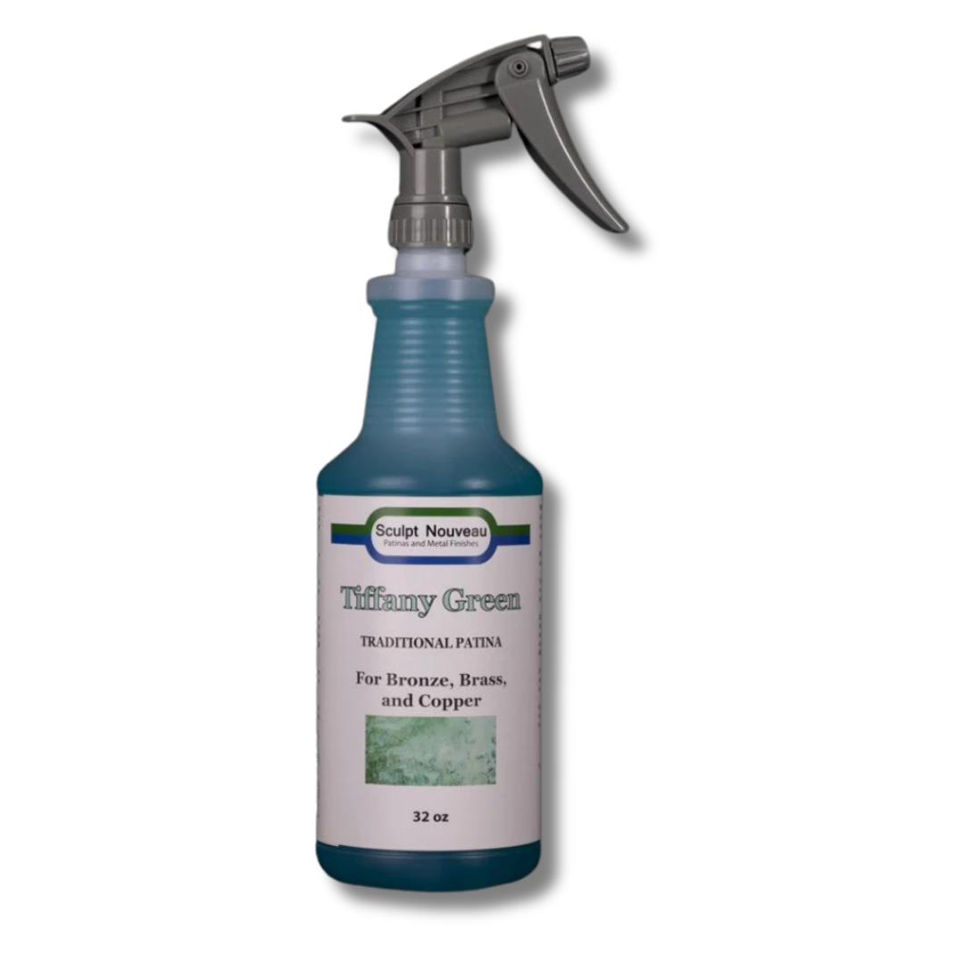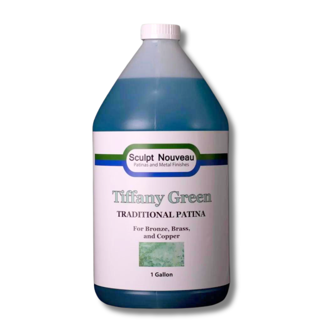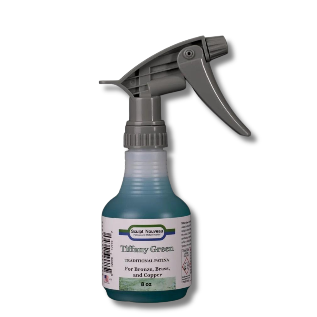 Tiffany Green is a cold patina for bronze, brass, and copper. It may be used both indoors and outdoors. If used outdoors, Tiffany Green should be applied in the shade. Once the patina has developed it may be placed in full sun. Tiffany Green will create a bright orange rust on iron and steel.