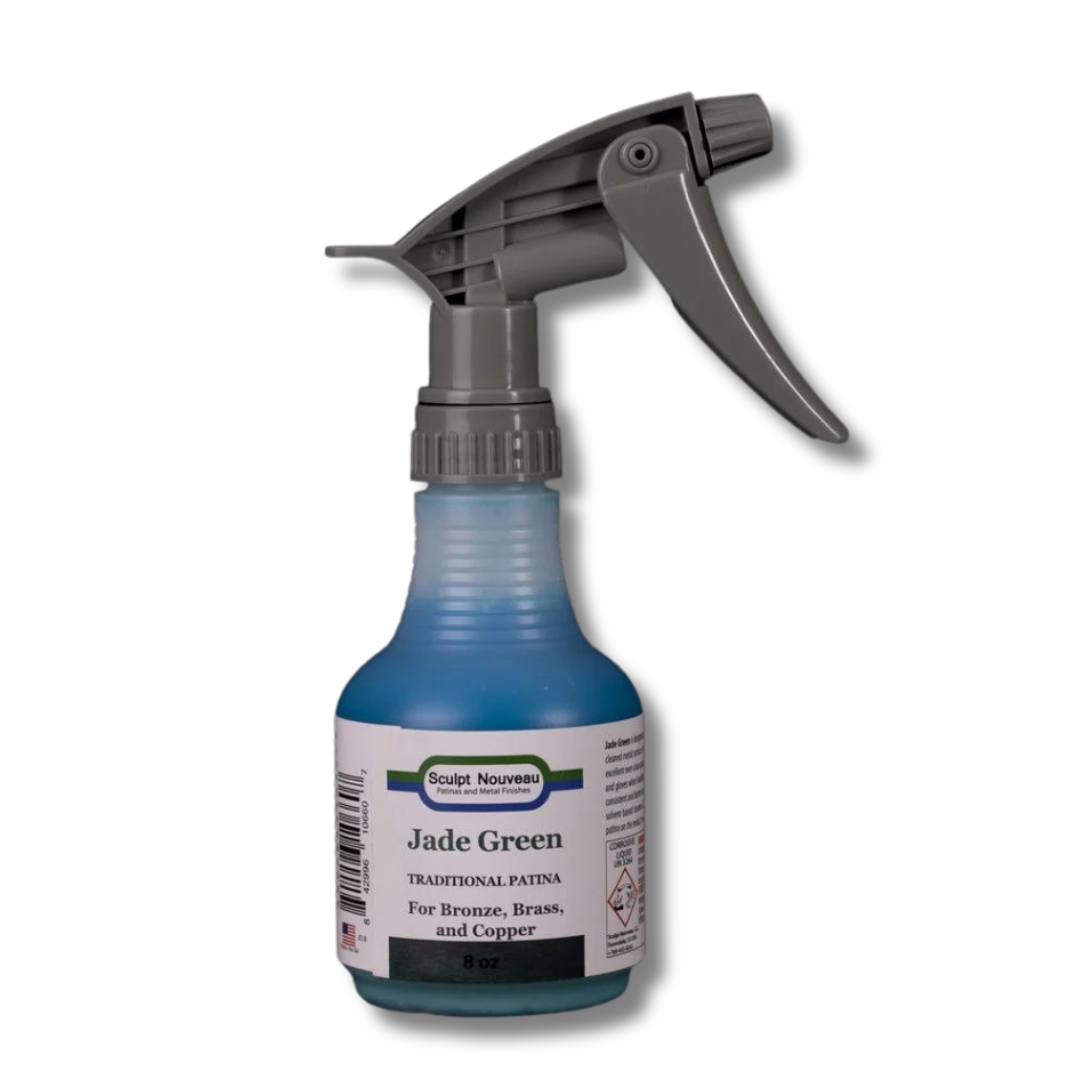 Jade Green Patina is a hot or cold patina for bronze, brass, and copper. If applied cold, the color develop into kelly green in about 12 hours. If applied hot, the color will be jade green when used with the Universal Black or Black Dye-Oxide Patinas. The finish should be protected with 2 coats of Clear Guard.