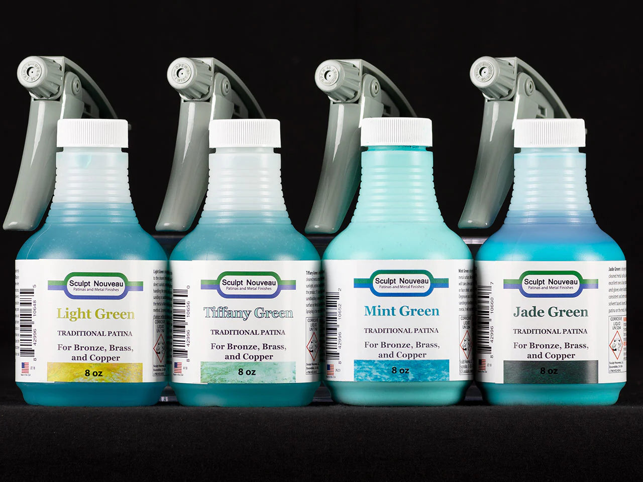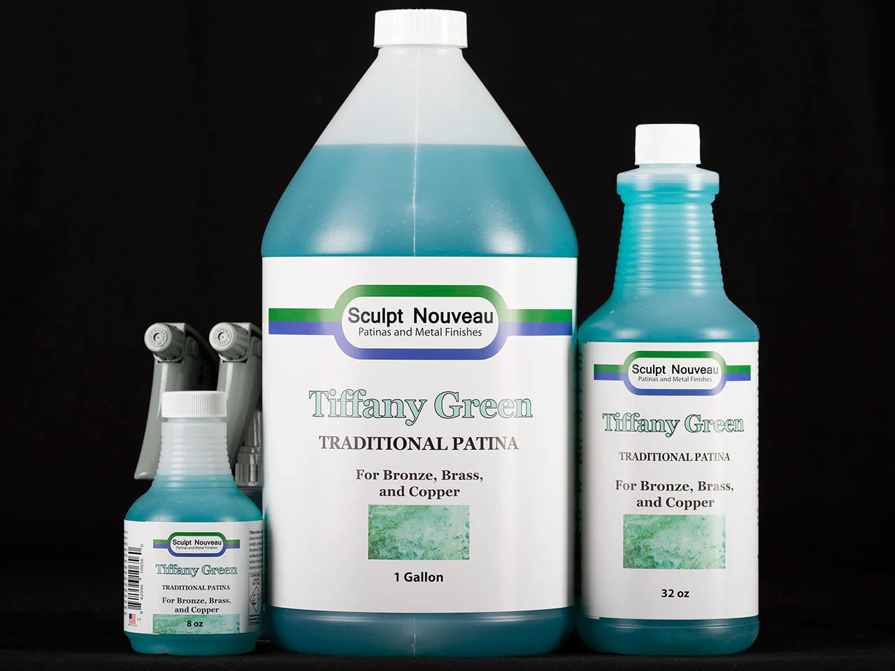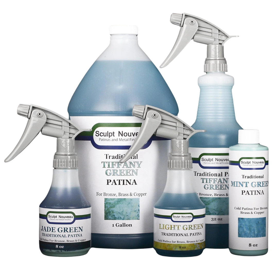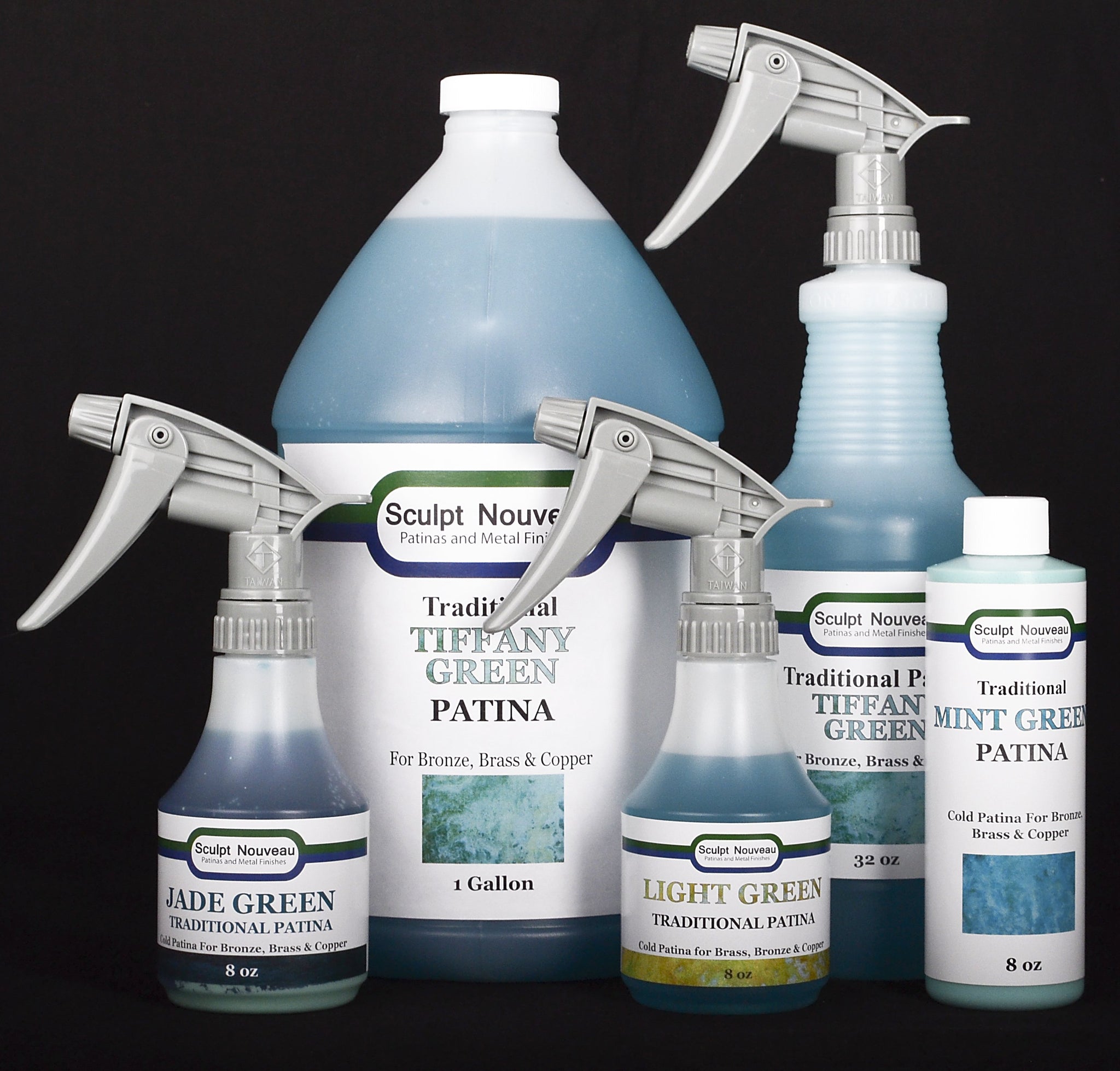 Traditional Green Patinas are available in 8oz., 32oz., 1 gal., and 5 gal. sizes. Spray tops are included with 8oz. and 32oz. bottles. One gallon of Traditional Green Patina generally covers 200 sq. ft. An alternative green when working outdoors in the sun is the Vista Green Patina.
